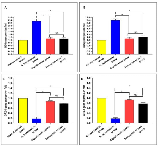 The effect of fenugreek extract on the expression levels of (A) iNOS in the small intestine, (B) iNOS in the caecum, (C) GPX-1 in the small intestine, and (D) GPX-1 in the caecum. (*) represents a significant difference (p < 0.05), and NS denotes a non-significant (p > 0.05) difference.
