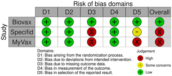 After screening, 95 records were deemed eligible for inclusion, for which we were able to retrieve 81 full-text reports (a complete bibliography of the reports that we failed to retrieve is available from the review repository—see the Data Availability Statement). Two of the retrieved reports were in languages other than English: one in German [64] and one in Spanish [65]. Both were successfully machine-translated for the purpose of eligibility assessment. After the full-text screening, 11 reports (8 publications and 3 electronic supplemental materials), collated into 3 studies, were included: BiovaxID (BV) [34,56,57,58,59,60,61,62,63,64,65,66,67,68,69,70], Specifid (SP) [33] (also known as FavId), and MyVax (MV) [35]. After a review of the included reports for relevant references, additional Google and trial registry searches, a forward citation search, and manual searches, 3 more eligible associated reports were included (BV [71]; SP [72,73]), leading to a total of 14 reports. In particular, the forward citation search was unhelpful, and the manual review yielded one additional report [72], a preliminary report of the SP trial, which did not contribute additional information. A full report of the forward citation and manual searches is available from the review repository (see the Data Availability Statement).