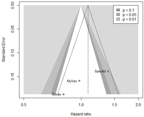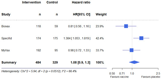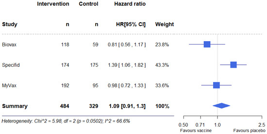 Three randomized controlled trials (RCT) met the inclusion criteria. The total number of patients was 813. The primary outcome was PFS. A meta-analysis showed that the hazards of disease progression in the vaccine group were higher than in the placebo group, but this difference was not statistically significant: Hazard ratio (HR) of 1.09 (95% CI, 0.91 to 1.3, p = 0.36). The certainty of evidence was moderate (Table 1).