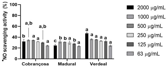 The antioxidant activity of hydroethanolic extracts from O. europaea Cobrançosa, Verdeal, and Madural was first determined spectrophotometrically at 517 nm; secondly, the FRAP method measured the reduction of the complex Fe3 + -TPTZ read at 593 nm. Lastly, the anti-●NO scavenging power was determined according to the method described in Soares et al., 2021, at 560 nm [36]. The tested extracts showed similar antioxidant behavior against both 2,2-difenil-1-picril-hidrazil (DPPH●) and ferric ion (Fe3+)-ligand complexes. Their reducing power followed a waning order of O. europaea Madural > Verdeal > Cobrançosa. The DPPH● radical scavenging activity exhibited by the O. europaea Madural and Verdeal extracts was better than their ferric reducing power: 19.9 ± 2.5 and 19.6 ± 2.4 mgTE/g sample, respectively (internal data). The least-powerful antioxidant extract was O. europaea Cobrançosa: 16.6 ± 0.5 mg AAE/g sample against FRAP and 13.6 ± 1.9 mgTE/g sample against DPPH● (internal data). Overall, regarding the scavenging activity of each OLE, the IC50 by ●NO was attained for concentrations above 2000 µg/mL extract (Figure 1 and Table 5).