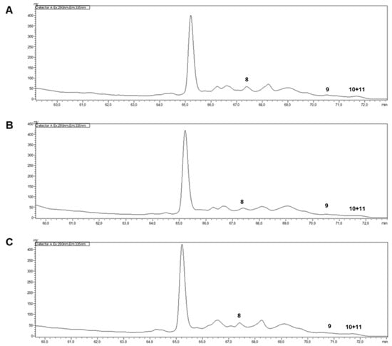 HPLC-FLD of hydroethanolic extracts of O. europaea leaves ((A)—O. europaea Cobrançosa; (B)—O. europaea Madural; (C)—O. europaea Verdeal; 8—α-tocopherol; 9—δ-tocopherol; 10 + 11—γ- and β-tocopherols).