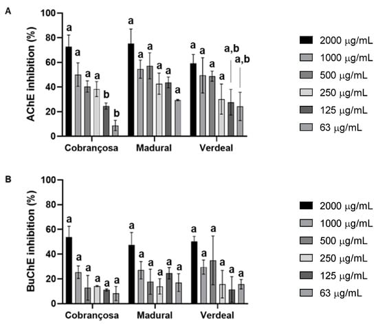 Acetylcholinesterase (AChE) (A) and butyrylcholinesterase (BuChE) (B) inhibition by extracts of O. europaea Cobrançosa, O. europaea Madural, and O. europaea Verdeal. Three assays were performed (n = 3). For each concentration tested, different lowercase letters mean statistically significant differences at p < 0.05.