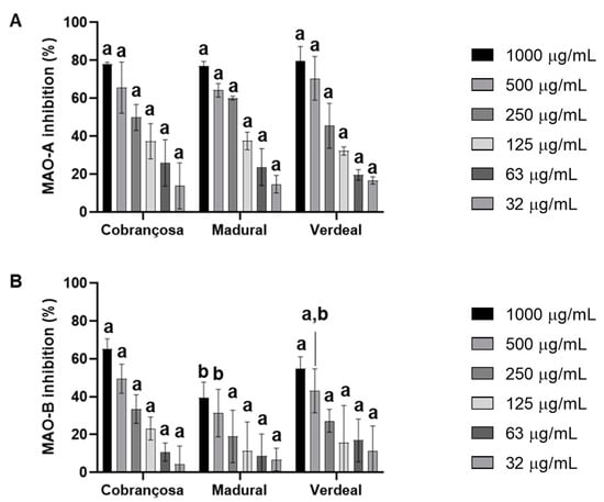 Monoamine oxidase A (MAO-A) (A) and B (MAO-B) (B) inhibition by extracts of O. europaea leaves. In total, three assays were performed (n = 3). For each tested concentration, different lowercase letters mean statistically significant differences at p < 0.05.