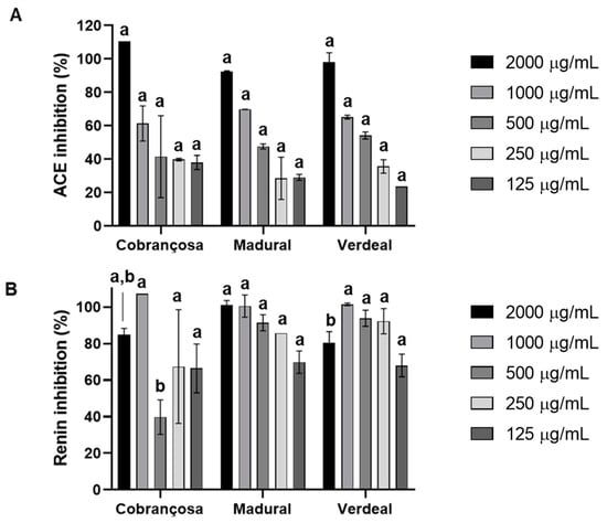 Angiotensin-converting enzyme (ACE) (A) and renin (B) inhibition by leaf extracts of O. europaea Cobrançosa, O. europaea Madural, and O. europaea Verdeal. In total, three assays were performed (n = 3). For each tested concentration, different lowercase letters mean statistically significant differences at p < 0.05.