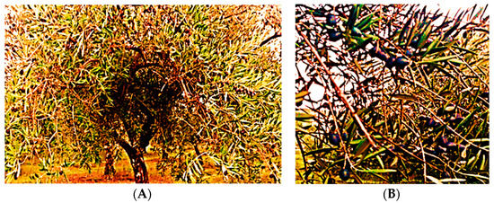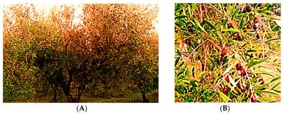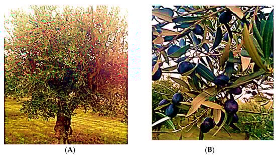 (A) Olive tree of O. europaea Cobrançosa. (B) Fruits and leaves of O. europaea Cobrançosa. Photos taken from the olive grove in Vale de Salgueiros, Mirandela, in May 2022.