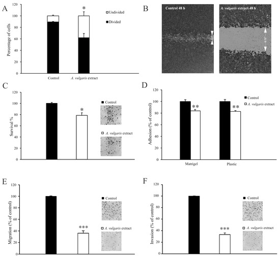 A. vulgaris extract abolishes the metastatic potential of the 4T1 cell line. Cells prestained with CFSE and exposed to an IC50 concentration (45 μg/mL) of A. vulgaris extract were analyzed via flow cytometry analysis after 72 h (A). Cells exposed to a subtoxic concentration (22.5 μg/mL) of A. vulgaris extract (B–F). Wound healing assay after 48 h (B). Colony formation (C), adhesion (D), migration (E), and invasion assays (F) were carried out after 72 h of cultivation. Results (C–F) are expressed as percentage of untreated cells (control). The data are displayed as mean ± SD calculated from three independent repeats and statistical significance was determined using the Student t-test. * p < 0.05; ** p < 0.01; *** p < 0.001 compared with untreated control.