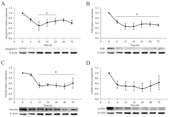 A. vulgaris extract downregulates the integrin signaling pathway. Relative expression of integrin β-1 (A), FAK (B), vinculin (C), and α-SMA (D) in 4T1 cells after the treatment with A. vulgaris extract at the indicated time points, analyzed by Western blot method. The results are expressed as mean ± SD based on three independent experiments, and * p values of less than 0.05 were considered statistically significant compared with the control. Statistical significance was assessed by one-way ANOVA followed by Tukey’s honest significant difference (HSD) post hoc test.