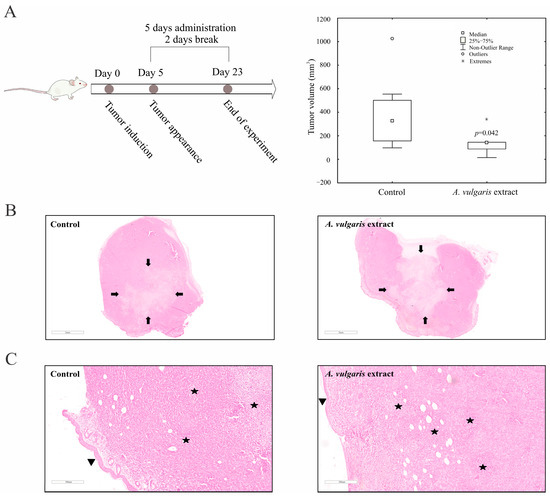 To define the effect of the A. vulgaris extract in vivo, tumors were induced in BALB/C mice by orthotopic implantation of 4T1 cells and treatment was started as soon as the tumors became palpable. The A. vulgaris extract significantly decreased tumor volume compared with the control group (p = 0.042) (Figure 4A). Histopathological analysis of the tumor tissue showed that the amount of necrosis was more extensive in the group treated with A. vulgaris extract compared with the control (30% and 25%, respectively). Necrosis occurred mostly in the form of geographic areas, and to a lesser extent in the form of necroptotic foci (around 2% in the control group and less than 1% in the treated group). Despite the significantly reduced tumor volume, no visual changes in the shapes and sizes of tumor cells among the groups were observed under the light microscope (Figure 4B,C).