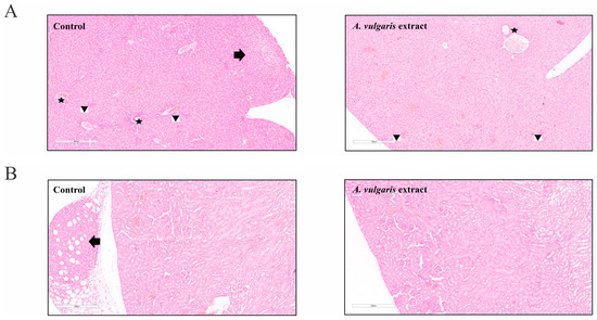 A. vulgaris extract treatment showed no signs of tissue toxicity. (A) Liver tissue of the control group and A. vulgaris extract-treated group (100× magnification; H/E staining) with arrow pointing to metastasis, stars marking portal tracts, and arrowheads showing sinusoidal extramedullary hematopoiesis, and (B) kidney tissue of the control group and A. vulgaris extract-treated group (100× magnification; H/E staining). Arrow denotes metastasis to the perirenal adipose tissue. No significant toxic changes were observed in either group.