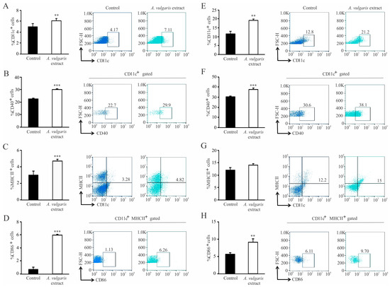 2.6. Administration of A. vulgaris Extract Increases the Percentage of and Activates Dendritic Cells in the Spleen and Tumor Microenvironment