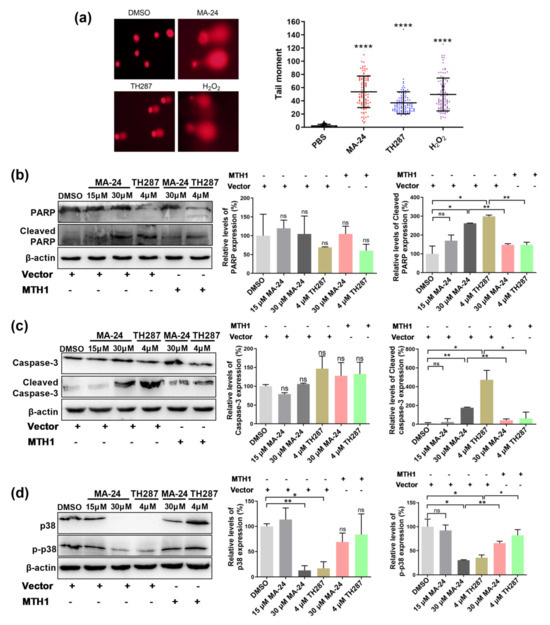 Since MTH1 inhibitors are thought to kill cancer cells by inducing DNA strand lesions, as a result of the cumulative 8-oxo-guanine (8-oxodG) and subsequent activation of base-excision repair (BER) [8]. Using an alkaline comet assay, we demonstrated that MA−24 significantly increased DNA strand breaks in MCF−7 cells, in line with the action of TH287 (Figure 4a). Because the expression of apoptosis-correlated proteins is known to be regulated by MTH1 inhibitors, we detected changes in the expression level of caspase 3, PARP, and their activated forms in MCF−7 cells after exposure to MA−24. In line with expectations, upregulation of cleaved-caspase 3 and cleaved PARP was observed while treated with 30 μM MA−24, which could be restored by the increase in the MTH1 protein (Figure 4b,c). While further confirming the mechanism of how MA−24 and TH287 induce cell apoptosis, we focused on the p38 MAPK pathway which is implicated in the survival of breast carcinoma cells. As is shown in Figure 4d, a decrease in p38 was measured upon treatment with small molecule inhibitors and overexpressing MTH1 would rescue the variation of p38 induced by MA−24. These results indicate that MA−24 induces DNA strand breaks, leading to the increased expression of cleaved-caspase 3 and PARP, and ultimately resulting in the apoptosis of MCF−7 cells.
