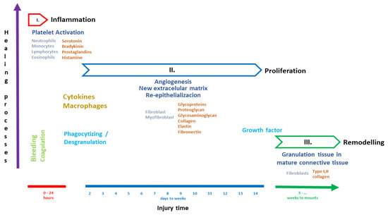 The healing cascade is an organized sequence of events, and classifications have been applied to it to facilitate our understanding of the dynamic processes it involves that closely determine healing [8,9]. Different authors divide up the healing process in different ways; some consider the initial step to involve inflammation, followed by proliferation and ending with repair in the remodeling stage [7,8,9] (Figure 1).