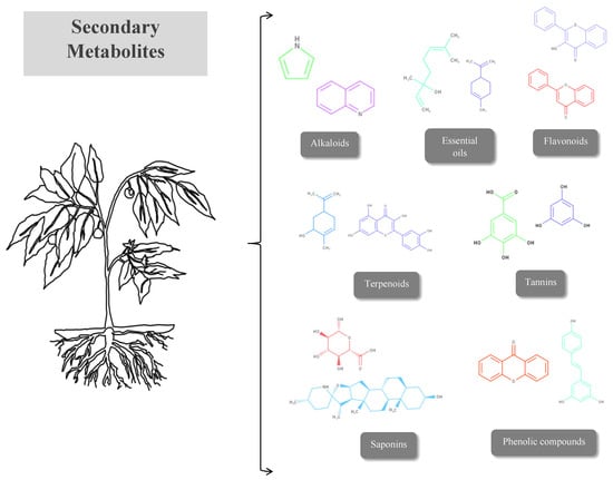 In the relevant literature, a variety of studies have addressed different plants with wound-healing properties. These studies have described the pharmacological activities of plants employed in wound healing and their molecular mechanisms to validate their traditional use and development into safe and effective herbal treatments for wounds. Due to the plants’ metabolism, secondary metabolites can be considered as bioactive molecules with therapeutic potential of great value in the pharmaceutical, cosmetic, and food industries, as concerns the design and formulation of medicines for different illnesses with less severe side effects [148,149,150,151,152]. The bioactive phytochemical compounds found include secondary metabolites such as alkaloids, essential oils, flavonoids, tannins, terpenoids, saponins, and phenolic compounds [153,154,155,156] (Figure 2).