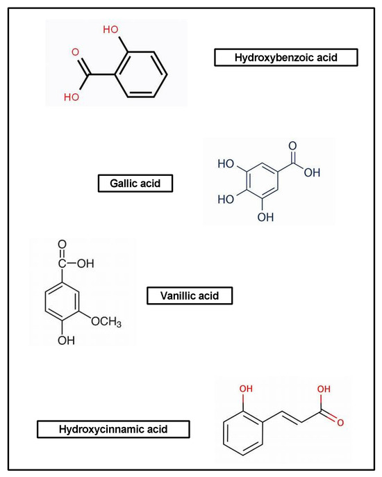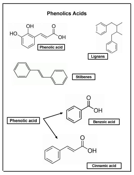 Phenolic acids are the bioactive compounds most widely found in legumes, cereals, vegetables, and fruits. They are also responsible for certain characteristics of foods, such as aroma and astringency, as well as color and flavor [153,155,156,157] (Figure 4).