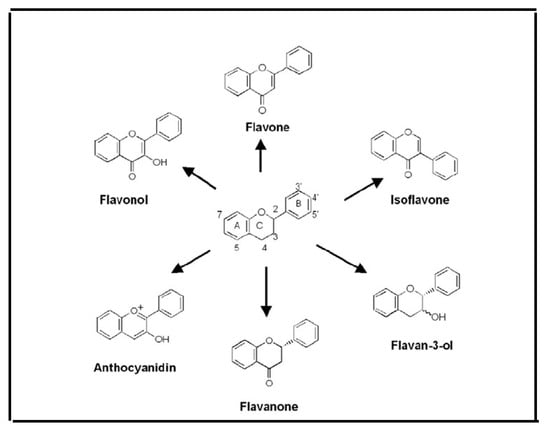 Prenylated flavonoids are found in plants’ roots, bark, seeds, and buds. These are part of a subclass of modified flavonoids with at least one lipophilic side chain of variable length, and they possess favorable biological activities, such as antimicrobial, antifungal, larvicidal, estrogenic, osteogenic, immunosuppressive, anticancer, anti-inflammatory, antioxidant, antiallergic and cytotoxic effects [188]. The group of prenylated flavonoids includes C-prenylated chalcones/dihydrochalcones, flavanones, flavones, flavonols, isoflavones, and, less frequently, O-prenylated forms (Figure 8).