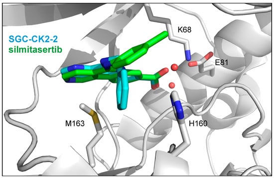 Overlay of X-ray cocrystal structures of SGC-CK2-2 (carbon atoms in teal) and silmitasertib (carbon atoms in green) bound to CSNK2A (PDB codes: 8BGC and 3NGA). The sidechains of catalytic lysine (K68), E81, M163, and H160 are shown as sticks (oxygen atoms in red, nitrogen in blue, and sulfur in yellow). Rotation of the aromatic 5-substituent in SGC-CK2-2 and silmitasertib relative to His160 is clearly seen.
