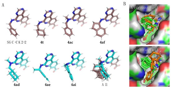 Analogs 4t, 4ac, 4ad, 4ae, 4af, and 4ai were assigned initial geometries using RDKit version 2022.3.5. Geometries were optimized using density functional theory in the Gaussian16 software package with a B3LYP level of theory, 6-311 + g(d) basis set, and a CPCM water solvent model []. Optimized geometries were locked and rigidly aligned to the crystal pose of the parent compound SGC-CK2-2 in CSNK2A (PDB: 8BGC) [] using the Schrödinger software suite version 2023-2. The protein structure of the CSNK2A (PDB: 8BGC) was prepared using the standard settings of Schrödinger protein preparation wizard to provide minor structure optimization and ensure optimal performance of the Glide docking. The positions of the hydrogen atoms were optimized, residue ionization and tautomer states were checked using PROPKA version 3.5.0 at pH 7, water molecules further than 3 Å away from the HET atoms were removed, and restrained minimization of the structure was performed with the OPLS4 force field, converging the heavy atoms to an RMSD of 0.3 Å. The resulting structure was used to generate the Glide receptor grid using the center of mass of the X-ray bound ligand with the inner and outer box sizes equal to 10 Å and 20 Å, respectively. To obtain the aligned poses of the analogs, each one was minimized in place, considering the protein environment, using the Extra precision refinement mode in Glide [,].