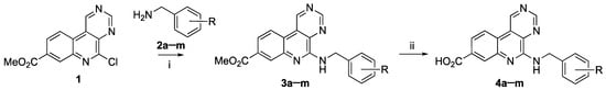 Counterparts of SGC-CK2-2 bearing substituted 5-benzylamino substituents were designed to explore the nature of the interaction with His160 observed in the X-ray cocrystal structure with CSNK2A (Figure 1). The synthesis of 5-benzylamino analogs used modifications of the previously reported synthetic methods (Scheme 1) []. Nucleophilic aromatic substitution (SNAr) reactions of commercially available pyrimido[4,5-c]quinoline methyl ester 1 with 2-, 3-, and 4-substituted benzylamines 2a–m afforded the corresponding naphthyridine analogs (3a–m). LiOH-mediated ester hydrolysis in MeOH afforded the free carboxylic acids (4a–m, Table 2) in a 42–92% overall yield.