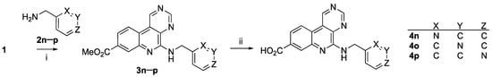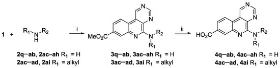 The reagents and solvents were used without any further purification after they were received from commercial suppliers. Methyl 5-chloropyrimido[4,5-c]quinoline-8-carboxylate (1) (catalog number EN300-26862632) was purchased from Enamine, Kyiv, Ukraine. Unless otherwise specified in degrees Celsius (°C), reactions were conducted under an argon atmosphere and at ambient temperature. Analytical Aluminum thin-layer chromatography (Al TLC) (performed on pre-coated fluorescent silica gel plates, 200 μm with an F254 indicator) and LC-MS were used to monitor the progress of reaction mixtures and the purity of fractions collected from flash column chromatography. A rotary evaporator was used to remove the solvent under reduced pressure (in vacuo). Following Al TLC separation, the position of each spot was detected using UV light (254/365 nm). Nuclear magnetic resonance (NMR) spectra and microanalytical data were collected for final compounds to confirm their identity and assess their purity. 1H and 13C NMR spectra were recorded in DMSO-d6 on a Avance 400 and 500 MHz (Bruker, Billerica, MA, USA). Chemical shifts are reported in parts per million (ppm), with residual solvent peaks referenced as the internal standard. Coupling constants (J values) are expressed in hertz (Hz). Spin multiplicities are described as singlet (s), broad singlet (bs), doublet (d), doublet of doublets (dd), triplet (t), quartet (q), pentent (p), and multiplet (m). Data were processed using MestReNova version 14.3.1-31739. High-resolution mass spectrometry samples were analyzed with a ThermoFisher Q Exactive HF-X (ThermoFisher, Bremen, Germany) mass spectrometer coupled with a Waters Acquity H-class liquid chromatograph system. Samples were introduced via a heated electrospray source (HESI) at a flow rate of 0.3 mL/min. Electrospray source conditions were set as follows: spray voltage 3.0 kV, sheath gas (nitrogen) 60 arb, auxiliary gas (nitrogen) 20 arb, sweep gas (nitrogen gas) 0 arb, nebulizer temperature 375 °C, capillary temperature 380 °C, RF funnel 45 V. The mass range was set to 150–2000 m/z. All measurements were recorded at a resolution setting of 120,000. Separations were conducted on a Waters Acquity UPLC BEH C18 column (2.1 × 50 mm, 1.7 μm particle size). LC conditions were set at 95% water with 0.1% formic acid (A) ramped linearly over 5.0 min to 100% acetonitrile with 0.1% formic acid (B) and held until 6.0 min. At 7.0 min, the gradient was switched back to 95% A and allowed to re-equilibrate until 9.0 min. Injection volume for all samples was 3 μL. Xcalibur (ThermoFisher, Breman, Germany) was used to analyze the data. Solutions were analyzed at 0.1 mg/mL or less based on responsiveness to the ESI mechanism. All observed species were singly charged, as verified by unit m/z separation between mass spectral peaks corresponding to the 12C and 13C12Cc-1 isotope for each elemental composition. Purity of synthesized of compounds was determined using NMR or LC–MS. All final compounds were >95% pure except for 4n (92%) and 4p (92%).