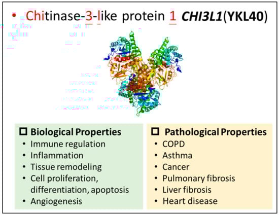 Chitinase-3-like protein-1 (CHI3L1), a type of glycoprotein located on chromosome 1q32.1, spans approximately 10 kilobases and consists of 10 exons encoding a 40 kDa glycoprotein that was initially discovered in the mid-1990s. Analyses of CHI3L1’s genomic structure have revealed several genetic variants, including single-nucleotide polymorphisms (SNPs) and copy number variations (CNVs) [1,2]. CHI3L1 is commonly found in both prokaryotes and eukaryotes, and it is known as YKL40 in humans and breast regression protein 39 (BRP-39) in mice [3]. The YKL40 protein, also known as acidic mammalian chitinase-related protein (AMCase), is a type of cytokine that is encoded by CHI3L1 and is commonly found in various cells and tissues, including immune cells, liver, brain, and tumor tissues [3,4,5,6]. CHI3L1 is involved in various physiological processes, such as cell proliferation, differentiation, apoptosis, angiogenesis, inflammation, and tissue remodeling [3,4,5]. CHI3L1(YKL40) can inhibit oxidative damage in the lungs, enhance adaptive immune responses, regulate cell apoptosis, stimulate macrophage activation, and aid in fibrosis and wound healing [1,6,7].