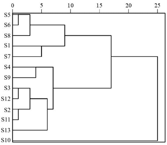 The hierarchical cluster analysis of 13 batches of Cibotii rhizoma was performed using the IBM SPSS Statistics (Version 27.0) software based on the standardization of 15 common peak areas using the inter-group join method and the squared Euclidean distance as the measure of sample similarity; the dendrogram of HCA is shown in Figure 2. According to the results of HCA, the cross-over phenomenon existed in the Cibotii rhizoma collected from different regions, and the quality difference of Cibotii rhizoma may not have been associated with the origin. When the squared Euclidean distance was 10, the 13 batches of Cibotii rhizoma samples were divided into three groups (G1, G2, G3). G1 (including S1, S5, S6, S7 and S8) mainly comes from the provinces of Guangxi and Sichuan. G2 (including only S10) comes from the provinces of Jiangxi, showed the lowest similarity evaluation compared to other samples. G3 (including S2, S3, S4, S9, S11, S12 and S13) mainly comes from the provinces of Guangxi, Guizhou, Fujian and Guangdong. The HCA classification results were consistent with the similarity evaluation results. This denoted that HCA was an efficient way to identify Cibotii rhizoma from different regions [19].