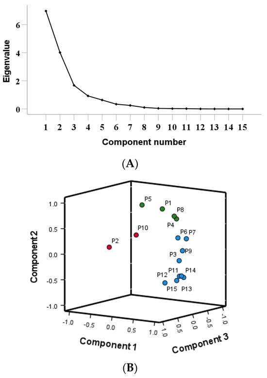 Using the peak areas of 15 common peaks from 13 batches of Cibotii rhizoma fingerprint as variables, the data were standardized using IBM SPSS Statistics (Version 27.0). Principal component analysis was performed on the standardized data. The results are shown in Table 4. The scree plot of the PCA is shown in Figure 3A. Combined with the mutation point of the scree plot, the three principal components were extracted for evaluation. Three principal components (PC1, PC2 and PC3) accounting for 46.430%, 26.763%, 11.182% of the total variance, respectively, were selected to represent the total variable information based on eigenvalue >1. The first three principal components occupied 84.375% of the total variable, which represented most of the raw data. The component matrix reflects the magnitude and direction of each variable’s contribution to the principal component. A larger value indicates a higher correlation with the principal component, while a negative value indicates a negative correlation with the principal component. From the 3D loadings plot of the PCA (Figure 3B), P3, P6, P7, P9, P11, P12, P13, P14 and P15 contributed the most to Principal Component 1, P1, P4, P5 and P8 contributed the most to Principal Component 2, P2 and P10 contributed the most to Principal Component 3 (P refers to the peak number). The first principal component has the largest characteristic value, and the weight value of its variables can reflect the correlation between chemical components and the quality of herbs to the greatest extent [20]. Unknown P3, P6, P7, P9, P11, P12, P13 and P14 make the greatest contribution to Principal Component 1, indicating that these components are important factors affecting the quality of Cibotii rhizoma.