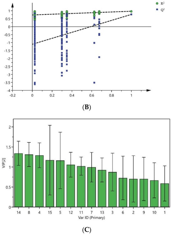 Score plot (A) and permutation test (B) of OPLS-DA, VIP values of 15 common peaks (C).