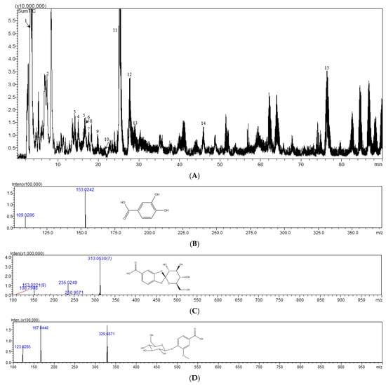 Peak 5 showed the [M-H]− ion at m/z 153.0242, by which its molecular formula was determined as C7H6O4. In the MS2 experiment, the fragment at m/z 109.0286 was corresponding to the loss of CO2. From the above analyses, this peak was deduced as protocatechuic acid by comparing with the literature [21] and confirmed by the reference substance, as shown in Figure 5B. Peak 6 was assigned the molecular formula of C13H14O9 by the [M-H]− ion at m/z 313.0530. When the [M-H]− ion was selected for MS/MS experiment, prolific fragmentation ions were obtained. The fragment ions at m/z 153.0221 and m/z 108.7908 were generated by the loss of C6H8O5 and CO2. From the above analysis, this peak was tentatively deduced as cyathenosin A [22], as shown in Figure 5C. Peak 9 displayed the [M-H]− ion at m/z 329.0871, corresponding to the molecular formula of C14H18O9. The MS2 fragments at m/z 167.0440 and m/z 123.0285 were corresponding to the loss of C6H10O5 and CO2; this peak was determined as vanillic acid 4-O-β-D-glucopyranoside [23], as shown in Figure 5D. Peak 11 displayed the [M-H]− ion at m/z 341.0865, corresponding to the molecular formula of C15H18O9. The MS2 fragments at m/z 281.0588 and m/z 179.0324 were corresponding to the loss of COOH and C6H11O5; this peak was determined as 1-caffeoyl-β-D-glucose [24], as shown in Figure 5E. Peak 14 showed the [M-H]− ion at m/z 411.0959, by which its molecular formula was determined as C18H20O11. In the MS2 experiment, the fragment at m/z 315.0666 corresponded to the loss of C5H5O2. From the above analyses, this peak was deduced as cibotiumbaroside G [25], as shown in Figure 5F.