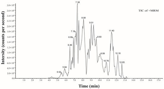 Using the UHPLC-MS/MS technique, we identified 30 known anthocyanin structures, including petunidin, cyanidin, delphinidin, malvidin, pelargonidin, and peonidin. Other flavonoid compounds, such as naringenin, were also detected. Additionally, phenolic compounds, mainly proanthocyanidins B1 and B2, were present. The structures, retention times (tR), and formulas of these compounds are presented in Table 1. The total ion chromatogram (TIC) is shown in Figure 1.