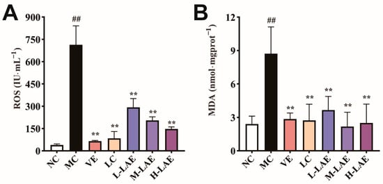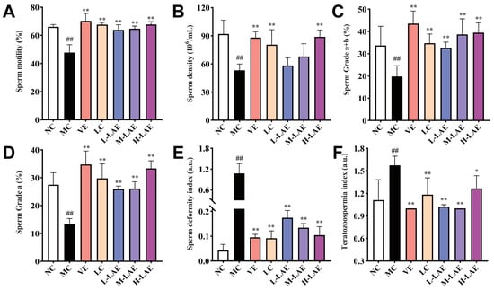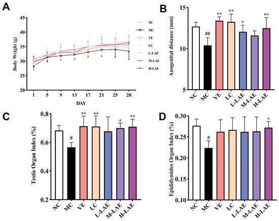 Changes in body weight, anogenital distance, the testis organ index, and the epididymis organ index were measured for each group. (A) body weight; (B) anogenital distance; (C) testis organ index; (D) epididymides organ index. All the data are presented as the means ± SDs (n = 6); * p < 0.05 and ** p < 0.01 compared to the model control group; # p < 0.05 and ## p < 0.01 compared to the normal control group. NC: normal control group (0.9% NaCl); MC: model control group (CdCl2, 5 mg/kg); VE: positive-drug group (vitamin E, 100 mg/kg, plus CdCl2, 5 mg/kg); LC: positive-drug group (L-carnitine, 500 mg/kg, plus CdCl2, 5 mg/kg); L-LAE, M-LAE, H-LAE: low-/middle-/high-dose treatment groups (LAE, 50/250/500 mg/kg, plus CdCl2, 5 mg/kg).