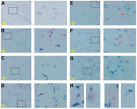 Evaluation of sperm morphology using the modified ultrafast Papanicolaou staining method. (A) NC group; (B) MC group; (C) VE group; (D) LC group; (E) L-LAE group; (F) M-LAE group; (G) H-LAE group. (H) Representation of abnormal sperm. The black arrows indicate head defects, the green arrows indicate midpiece defects, the red arrows indicate tail defects, and the blue arrows indicate excess cytoplasmic droplets in sperm. Permanent smears of sperm cells from all groups were observed under an optical microscope at 400× magnification (n = 6).