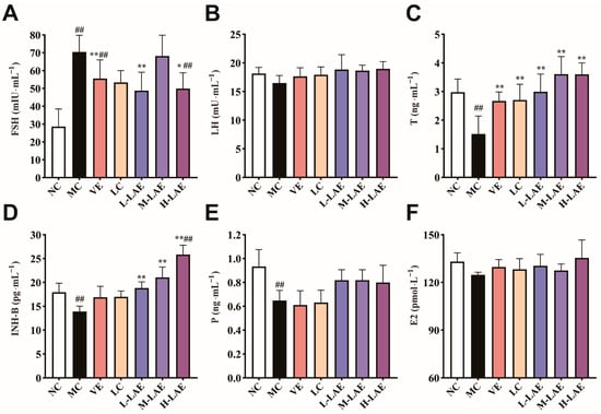The serum concentration of FSH increased significantly in the MC group but decreased significantly following LAE intervention compared to that in the MC group (p < 0.05; Figure 5A). FSH acts on Sertoli cells, stimulating the production of INH-B, which, in turn, exerts negative feedback on the pituitary gland to regulate the secretion of FSH. We found that the MC group had significantly lower INH-B levels than the NC group, whereas H-LAE treatment effectively reversed these changes. The H-LAE group presented significantly greater INH-B levels than the MC and NC groups (p < 0.01; Figure 5D). Exposure to Cd significantly reduced the serum T level (p < 0.01; Figure 5C). Similarly, after administering VE, LC, L-LAE, M-LAE, or H-LAE, the T levels increased and were significantly greater than the T levels in the MC group (p < 0.01). LH can stimulate Leydig cells to synthesize and release T; however, the observed changes were not significant (Figure 5B). Circulating female hormone levels, such as E2 and P levels, can also regulate male hormone levels by modulating the hypothalamic–pituitary–gonadal axis (HPGA). However, the differences were not significant because their level of expression was low.