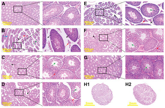 The H&E-stained sections showed pathological changes in the cross-sections of the testicular tissues. The testicular tissues of the mice in the NC group exhibited intact testicular membranes, densely packed seminiferous tubules, and abundant interstitial cells (Figure 6H1). With sexual maturation, the lumina of the seminiferous tubules exhibited normal meiosis and multiple layers of spermatogenic cells, including spermatogonia, primary spermatocytes, secondary spermatocytes, and spermatids. The tubules produced a large number of mature sperm cells with flagella, and no abnormalities were observed (Figure 6A). In contrast, testicular tissues of the MC group showed significant atrophy or localized dilatation of seminiferous tubules (indicated by blue arrows). The number of interstitial cells was significantly reduced, and some proliferative cell layers had thickened (indicated by red arrows). This led to an increase in intertubular space (indicated by black arrows), fragmentation, and dispersion of the seminiferous tubules. Disruption of the multilayered epithelial structure of the seminiferous tubules resulted in a decrease in the number of epithelial cells, abnormal morphology of Sertoli cells, detachment of germ cells, luminal enlargement, and a significant decrease in mature sperm cells (indicated by green arrows). This caused severe pathological changes and sperm blockage (Figure 6B). Although the degree of testicular lesions improved slightly in the VE and LC groups, the size of the seminiferous tubule lumina still increased, and the interstitial cell layers became thicker. However, the LC group showed a significant increase in the number of mature sperm cells in the lumina (Figure 6C,D). After L-LAE intervention, the integrity of the spermatogenic epithelium was partially restored. After administering M-LAE and H-LAE, we found significant protective effects of LAE on testicular tissue structure. The seminiferous tubules were closely arranged, spermatogenic cell morphology was normal, and the number of interstitial cells was also normal. However, abnormally dilated seminiferous tubules were still present (Figure 6E–G).