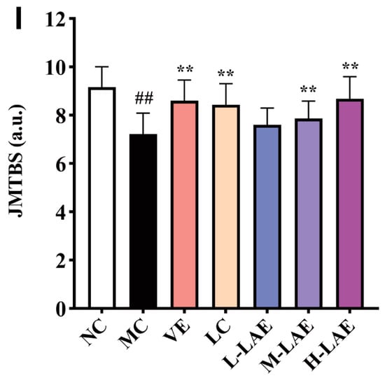 Based on the histological observations, we assessed the condition of the testicular seminiferous tubules using Johnsen’s scoring method (Figure 6I). Due to a significant reduction in the number of late-stage sperm cells in the tubules after exposure to Cd, the scores decreased significantly (p < 0.01). In contrast, the VE, LC, M-LAE, and H-LAE groups exhibited significantly improved integrity of the spermatogenic epithelium, thus protecting the sperm production process. The scores of the above groups were significantly different from those of the MC group (p < 0.01).