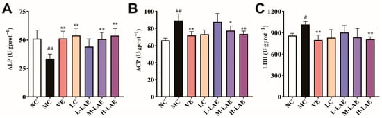 Changes in the ALP, ACP, and LDH levels. (A) ALP; (B) ACP; (C) LDH. All the data are presented as the means ± SDs (n = 6); * p < 0.01 and ** p < 0.01 compared to the model control group; # p < 0.01 and ## p < 0.01 compared to the normal control group. The grouping and abbreviations used are consistent with the descriptions provided earlier.