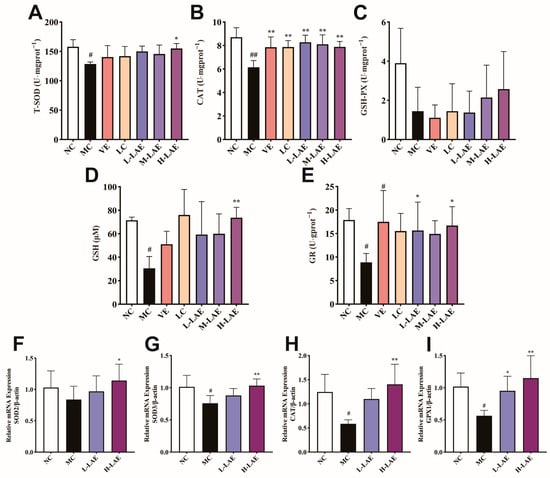 In the MC group, the activity of antioxidant enzymes such as T-SOD, CAT, and GR decreased significantly, but the activity of GSH-PX did not significantly change (Figure 9A–C,E). The mRNA expression levels of the SOD3, CAT, and GPX1 genes were also significantly downregulated in the MC group relative to their corresponding levels in the NC group (p < 0.05). However, no significant changes in the SOD2 gene were found (Figure 9F). The H-LAE group exhibited significantly greater T-SOD and glutathione reductase (GR) activities (p < 0.05) and significantly greater SOD3 and GPX1 mRNA expression levels than the MC group (p < 0.01; Figure 9G,I). A decrease in the level of GR led to a reduction in the capacity to catalyze the conversion of oxidized glutathione (GSSH) to glutathione (GSH), resulting in a significant decrease in the GSH levels in testicular tissue (p < 0.05). However, the GSH levels increased in the H-LAE group (Figure 9D). In all the LAE treatment groups, CAT activity significantly increased, and the CAT gene expression increased (p < 0.01; Figure 9H).