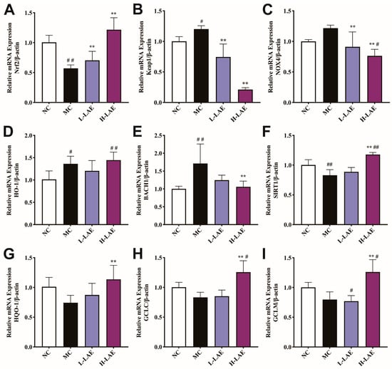 The Keap1/Nrf2 axis is a key regulator of oxidative stress. To assess the mRNA expression of essential oxidative stress-related genes (Figure 10), we performed RT–qPCR. The mRNA levels of Nrf2 and SIRT1 were significantly lower in the Cd-exposed group than in the NC group (p < 0.01). In contrast, the mRNA levels of Keap1 (p < 0.05), HO-1 (p < 0.05), and BACH1 (p < 0.01) were significantly greater in the Cd-exposed group than in the NC group. Compared to those in the MC group, the low-dose and high-dose LAE treatment groups exhibited significant upregulation of the Nrf2 gene but significant downregulation of the Keap1 and NOX4 genes (p < 0.01). However, in the MC group, the changes in the expression of the NOX4, NQO-1, GCLC, and GCLM genes were not significant relative to those in the NC group. The expression of the HO-1, GCLC, and GCLM genes in the H-LAE group was significantly upregulated compared to that in the NC group.