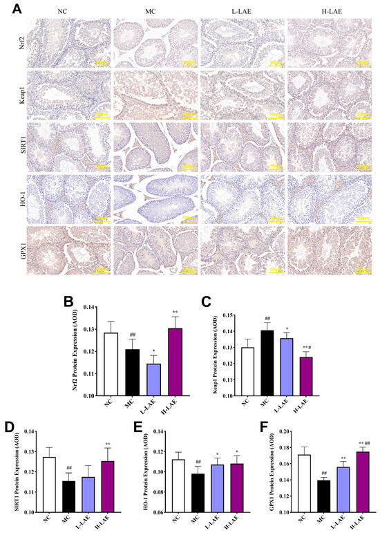 Immunohistochemistry (IHC) was conducted on cross-sections of paraffin-embedded testicular tissues; a brownish-yellow color indicated positive protein expression (Figure 11A). The average optical density (AOD) was calculated by assessing the ratio of the integrated optical density (IOD) value to the positive area, which allowed relative protein quantification (Figure 11B,C). In the MC group, a lower AOD of the Nrf2 protein was associated with weaker positive staining and a decrease in protein expression following Cd induction (p < 0.01). In contrast, the MC group exhibited greater AOD of the Keap1 protein, reflecting an increase in protein expression following Cd induction (p < 0.01). In the H-LAE group, an increase in the positive response to the SIRT1 and Nrf2 proteins was observed, with significantly greater protein expression (p < 0.01). Conversely, a significantly lower percentage of cells with a positive response to the Keap1 protein and significantly lower protein expression were noted (p < 0.01). Similarly, the L-LAE group presented significantly greater Nrf2 expression and significantly lower Keap1 protein expression (p < 0.05). The role of SIRT1 in deacetylating and activating the nuclear transcription factor Nrf2 was evident, as supported by the increased stable expression of Nrf2. LAE also decreased Keap1 levels, thereby activating Nrf2 through a reduction in ubiquitination via the Keap1/Nrf2 pathway. This process promoted the downstream expression of HO-1 and GPX1, resulting in elevated levels of antioxidant enzymes. Activated Nrf2 significantly increased the activity of antioxidant enzymes, such as T-SOD, CAT, and GR, while inhibiting MDA and ROS production. These changes mitigated oxidative damage to testicular tissue.