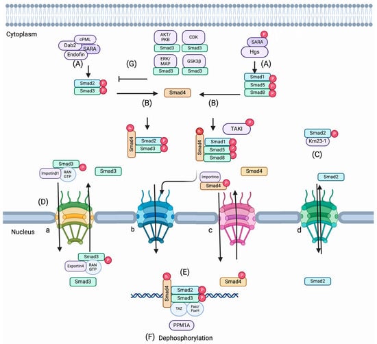 SMAD proteins exist in dynamic states in the cytoplasm or nucleus with or without the stimulation of TGF-β, respectively. A study by Nicolás et al. [29] showed that both uninduced and induced cells with TGF-β could exhibit variation in SMAD distribution. Accumulating evidence supports that a few proteins are involved in the activation, retention, and trafficking of SMADs from the cytoplasm to the nucleus and vice versa (Figure 2). Activation begins with phosphorylation of the GS region on the type I receptor TGF-β (TGF-βRI) by the type II receptor (TGF-βRII), which leads to the affinity of receptor I for sxsmotif of R-SMADs at the C-terminal [30]. Thereby, the two C-terminal serines of R-SMADs are phosphorylated with substantial interaction between the R-SMADs and the type I receptor. This event is critical to changing the conformation of R-SMADs and allowing them to dissociate consequently from the receptor complex [31]. In this context, the association of the endocytic protein SARA (SMAD Anchor of Receptor Activation) [32,33] and a few SARA-associated proteins (e.g., cPML [34,35], endofin [32], and Dab2 [36] promote R-SMAD activation by recruiting them to the TGF-β receptor. Phosphorylated R-SMADs can interact with SMAD4 and form heteromeric complexes after dissociation from the TGF-β receptor complexes and subsequently transport to the nucleus [35,36,37,38]. It was also found that hepatocyte growth factor-regulated tyrosine kinase substrate (Hgs) is associated with SARA and promotes phosphorylation of SMADs 1, 5, and 8 induced by BMP signals [39,40]. The conformational change driven by the phosphorylation of R-SMAD monomers supports the dissociation from the receptor complex as well as promotes the interaction between the R-SMAD, which is phosphorylated at the C-terminal in addition to SMAD4 and another R-SMAD. Thus, different compositions of SMAD trimeric complexes can exist as a complex of R-SMAD monomers (activated homo or heterotrimer) and/or a complex of phosphorylated one or two R-SMADs with SMAD4 in the cytoplasm [41,42,43,44].