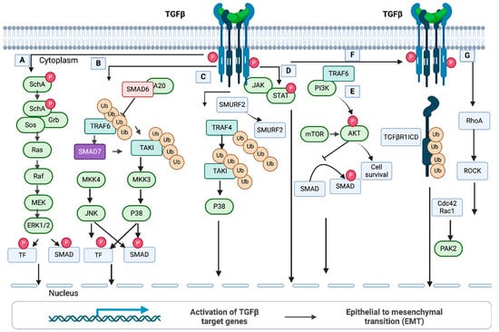 Non-SMAD, non-canonical TGF-β pathways. (A) ERK/MAP kinase pathway. TGF-β activates the ERK/MAP kinase pathway by direct phosphorylation of ShcA, which subsequently activates downstream signals. In conjugation with SMADs, Erk regulates target gene expression and EMT via the downstream TFs (transcription factors). (B) JNK and p38 MAP kinase pathway. The Tumor Necrosis Factor Receptor-Associated Factor 6 (TRAF6) and TGF-β complexes interact after activation of the receptors. TRAF6 is then induced by an autoubiquitylation and subsequently stimulates TAKI through polyubiquitylation. This event can lead to activation of the p38 MAP kinase pathway. (C) The MAP kinase pathway via TRAF4 (Tumor Necrosis Factor Receptor-Associated Factor 4). TRAF4 is auto-ubiquitylated upon ligand binding and is recruited to the TGF-β receptor complex. (D) JAK/STAT (the Janus Kinase/Signal Transducer and Activator of Transcription) pathway. Phosphorylation and activation of STAT is initiated by JAK, which interacts with TGF-β receptor type I. (E) PI3/AKT/mTOR pathway. TRAF6 polyubiquitylates the regulatory subunits of PI3K, p85α. Then, a complex is formed between the TGF-β receptor type I and p85α, resulting in activation of PI3K and AKT. Phosphorylation of AKT prevents SMAD3-mediated signaling. (F) TGF-β type I receptor intracellular domain signaling. The interaction of TRF6 and TGF-β receptor I results in polyubiquitination of TGF-β receptor I at Lys63 and subsequent degradation by TNF-alpha converting enzyme (TACE). TACE is not shown here. The newly formed intracellular domain (ICD) of TGFβ receptor I, named TGFβRI ICD, associates with the transcriptional factor to activate genes. (G) Rho-like GTPase pathway. Activation of Rho GTPase is promoted by both SMAD and non-SMAD-mediated signaling. After stimulation, Rho-like proteins Cdc2 and Rac1 are activated, which drive actin reorganization through signals from PAK2. This figure has been adapted from Tzavlaki and Moustakas, 2020 [43].