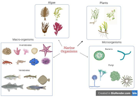 These secondary metabolites are synthesized by marine organisms as a survival and defence mechanism against other organisms, thus making them potential sources of bioactive compounds. With the emergence of various infectious diseases coupled with the menace of antibiotic resistance, marine organisms serve as a rich source of novel bioactive compounds for managing current and future viral diseases. The diversity of marine species (Figure 1) allows all kinds of potent metabolites to be isolated and tested for their potential pharmacological benefits to humans. Some bioactive compounds isolated and identified from marine organisms include terpenes, peptides and proteins, polysaccharides, lipids, alkaloids, and macrolides. The range of these compounds is related to the diverse mechanisms used by marine organisms to increase survival.