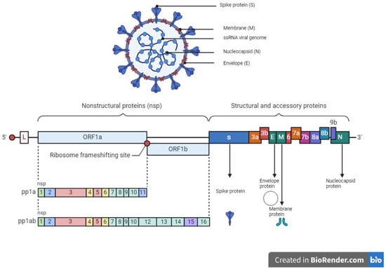 The SARS-CoV-2 which caused the severe acute respiratory coronavirus disease 2019 (COVID-19) belongs to the Coronaviridae family with a zoonotic potential, thus transmitted from humans and other mammals [134]. It shares a similar genomic sequence with the original SARS-CoV (~79.5% similarity) and BatCoV RaTG13 (~96% similarity). SARS-CoV-2 is a 50–200 nM positive-sense single-stranded enveloped RNA virus (+ssRNA) with a genome size of 28–30 kb [135,136,137]. The genome of SARS-CoV-2 consists of over 29,000 bases and codes for 29 proteins. Of the 29 proteins, the viral genome encodes 4 structural proteins and 16 non-structural replicate polyproteins which play a crucial role in the viral replication complex (Figure 2). The structural proteins include the spike (S) glycoprotein which binds to the host ACE2 receptor to initiate infection, small envelope (E) glycoprotein, and membrane (M) glycoprotein distributed along the viral envelope, and nucleocapsid (N) phosphoprotein which is an RNA-binding protein that facilitates the packaging of the genome and protects the viral genome [137,138]. Structural proteins are important for infection and replication in the host cell, thus making them ideal candidates or targets for antiviral therapies. The non-structural proteins (NsPs) are synthesized as long polypeptides which release the RNA-dependent RNA polymerase (RdRp), Nsp12, when activated by the main protease (MP), Nsp5. MP can be targeted by antiviral drugs against SARS-CoV-2, given its key role in virus replication and transcription [139,140].