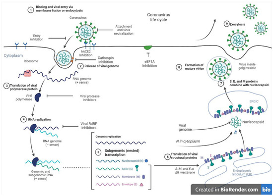 Infection of host cells by SARS-CoV-2 transmission occurs via endocytosis, which involves the interaction of host cell surface receptors (fusion) with endosomal components. The spike proteins are essential for the entry of the virus into a host cell. Particularly, the S1/S2 subunit facilitates attachment to the cell and subsequent fusion. It requires initial priming by the transmembrane protease, serine 2 (TMPRSS2), cysteine protease, and cathepsin L (CatL). In the host cell, the angiotensin-converting enzyme 2 (ACE2), a type I membrane receptor protein found in the lungs and arteries [137], serves as the binding site for SARS-CoV. The SARS-CoV-2 virion attaches to the enzymatic domain of ACE2 on the surface of cells via the receptor-binding domain (RBD) of the S1 unit, and subsequently, the cell TMPRSS2 opens the S protein, allowing for the fusion of the S2 subunit and ACE2 [141]. This results in endocytosis and the translocation of both the virus and enzyme into endosomes [142]. The virus subsequently escapes when the pH of the endosome drops or is cleaved by cathepsin, thus releasing its RNA into the cell cytoplasm. The virus then replicates and spreads new copies of the virus to infect more cells [136,141].