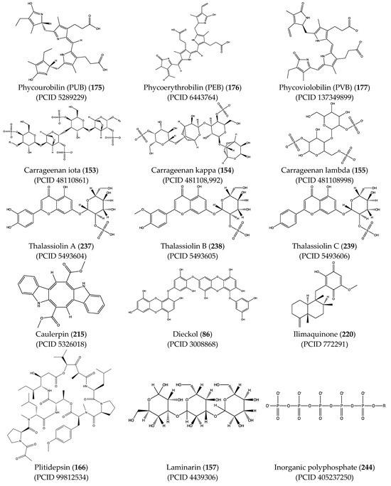 As with PCB (174), in silico analysis predicted that other phycobilins such as phycourobilin (PUB) (175), phycoerythrobilin (PEB) (176), and phycoviolobilin (PVB) (177) can bind to SARS-CoV-2 Mpro and PLpro with similar affinity (between −8.2 and −10.0 kcal/mol) [181,182]. Another pigment that can bind to components of SARS-CoV-2 is C-phycocyanin (178), a phycobiliprotein from the blue-green algae Arthrospira platensis. Raj et al. [183] reported that C-phycocyanin (178) competes with ATP for binding to the active site of nsp-12.