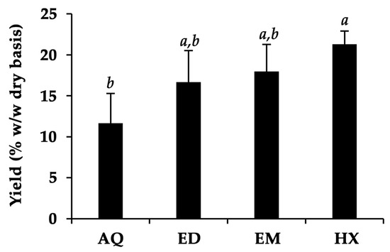 The yields of A. domesticus extracts, including aqueous extract from thermal solvent extraction (AQ), ethanolic extract from thermal solvent extraction (ED), ethanolic extract from maceration (EM), and hexane extract from maceration (HX). The data are shown as mean ± SD (n = 3). The lower-case letters (a and b) indicate significant differences between the yields of the respective A. domesticus extracts. Statistical significance was analyzed using one-way ANOVA followed by a post hoc Tukey test (p < 0.05).