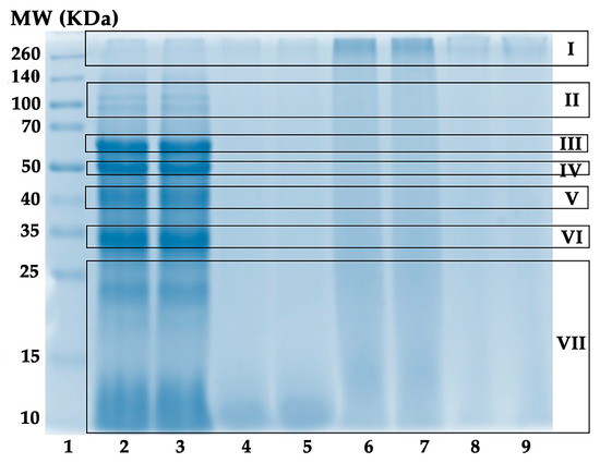 In contrast to AQ, the accumulation of protein on the top of the lanes with MW > 260 kDa (I) could be a result of protein glycation, cross-linking, or aggregation [57,65], intensely in EM (lanes 6 and 7) and faintly in HX (lane 8 and 9). A possible explanation could be attributed to the difference in the extraction techniques. Generally, a higher temperature can disrupt protein structures, resulting in protein unfolding and denaturation [66]. For EM and HX, which were prepared by maceration at ambient temperature, their large proteins were obstructed and could not migrate through the gel.