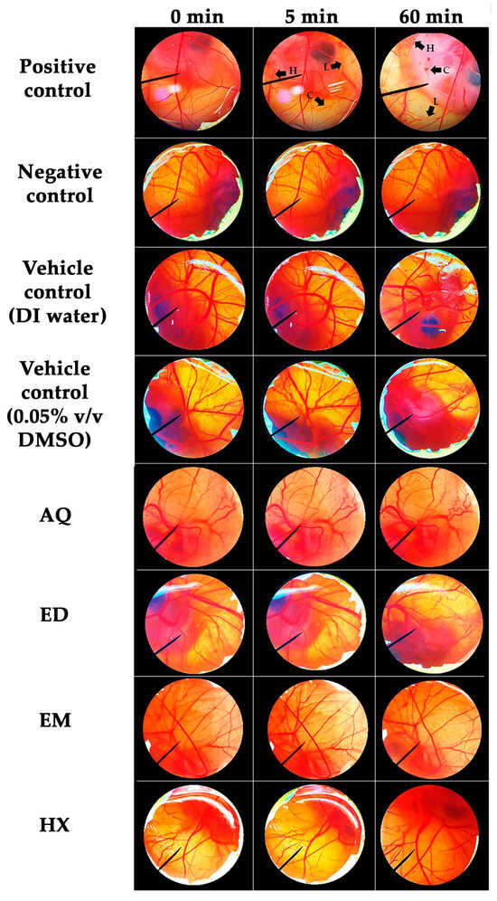 Effects of positive control (1% w/v SLS), negative control (0.9% w/v NaCl solution), vehicle controls (DI water and 0.05% v/v DMSO), and A. domesticus extracts, including aqueous extract from thermal solvent extraction (AQ), ethanolic extract from thermal solvent extraction (ED), ethanolic extract from maceration (EM), and hexane extract from maceration (HX), on the CAM with contact times of 0, 5, and 60 min. The black arrows indicate damaged sites on the CAM after application. L represents vascular lysis, H represents hemorrhage, and C represents coagulation.