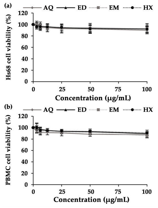 Cytotoxic effects of A. domesticus extracts on Hs68 cells (a) and PBMCs (b) after 48 h of treatment. A. domesticus extracts comprised aqueous extract from thermal solvent extraction (AQ), ethanolic extract from thermal solvent extraction (ED), ethanolic extract from maceration (EM), and hexane extract from maceration (HX). The data are shown as mean ± SD (n = 3).
