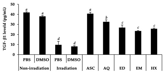Levels of TGF-β1 stimulated by A. domesticus extracts, including aqueous extract from thermal solvent extraction (AQ), ethanolic extract from thermal solvent extraction (ED), ethanolic extract from maceration (EM), and hexane extract from maceration (HX) at a concentration of 100 µg/mL in Hs68 cells after UVB exposure. Ascorbic acid (ASC) was used as a positive control. PBS and DMSO were used as vehicle controls. The data are shown as mean ± SD (n = 3). The lower-case letters (a, b, c, and d) indicate significant variability among A. domesticus extracts. Statistical significance was analyzed using one-way ANOVA followed by a post hoc Tukey test (p < 0.05).