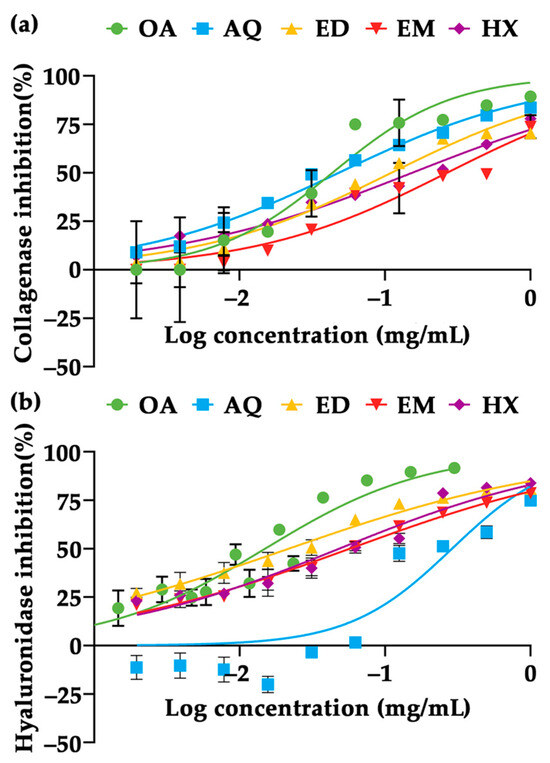 Dose–response curves of collagenase inhibition (a) and hyaluronidase inhibition (b) of A. domesticus extracts, including aqueous extract from thermal solvent extraction (AQ), ethanolic extract from thermal solvent extraction (ED), ethanolic extract from maceration (EM), and hexane extract from maceration (HX). Oleanolic acid (OA) was used as a positive control. The data are expressed as mean ± SD (n = 3).